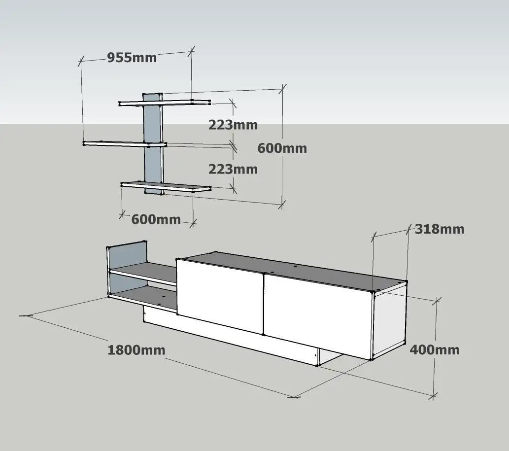 - Olohuoneen kalusteet on valmistettu melamiinipinnoitetusta lastulevystä (MDP), paksuus – 18 mm
