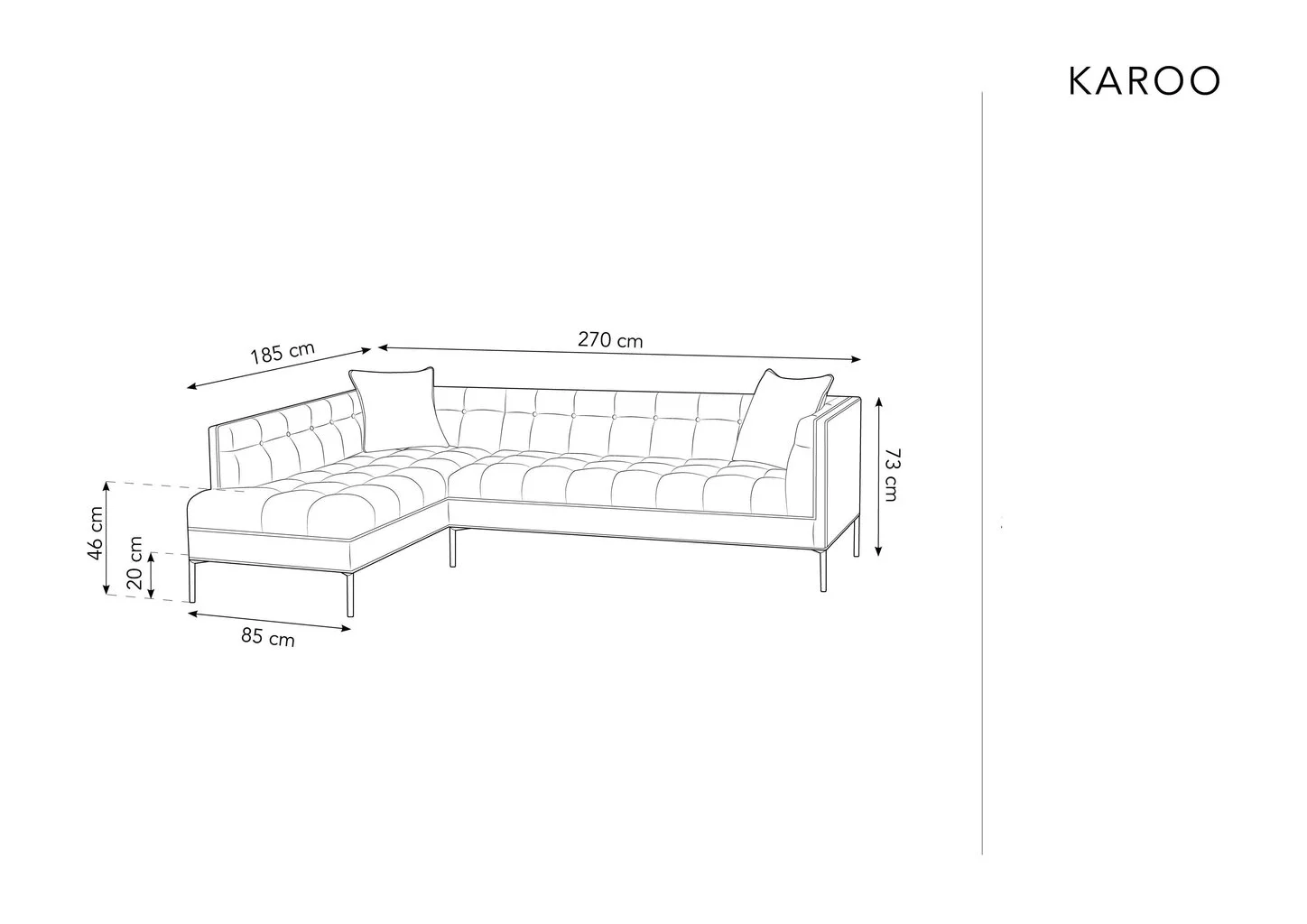 - Kulmasohvan mitat: pituus – 270 cm, syvyys – 185 cm, korkeus – 73 cm.