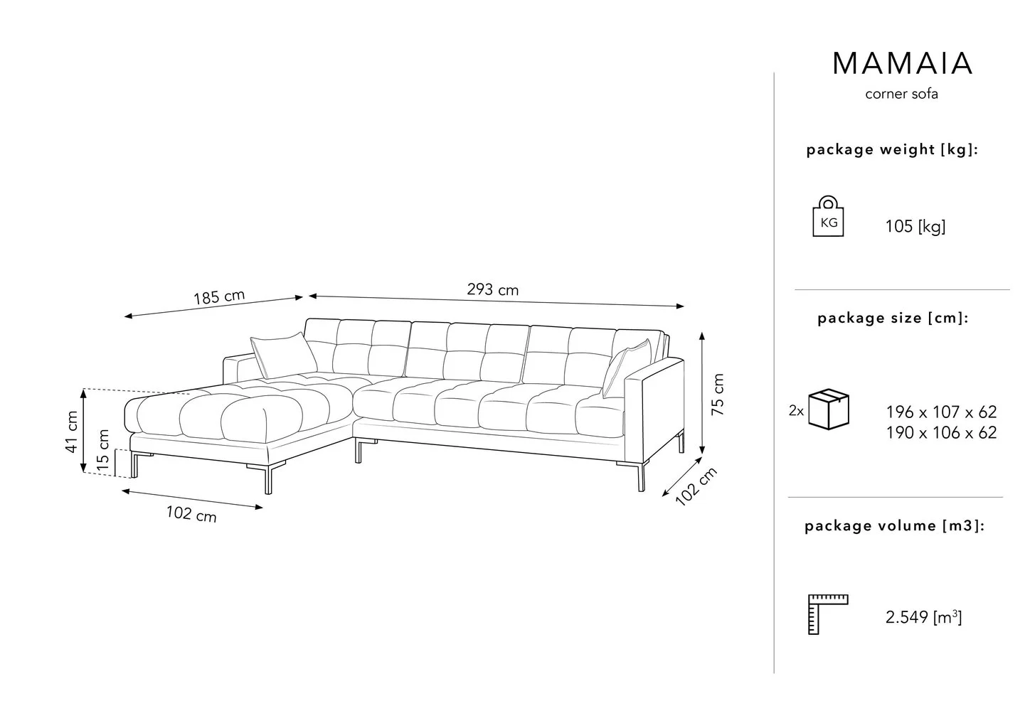- Kulmasohvan mitat: pituus – 293 cm, syvyys – 185 cm, korkeus – 78 cm.