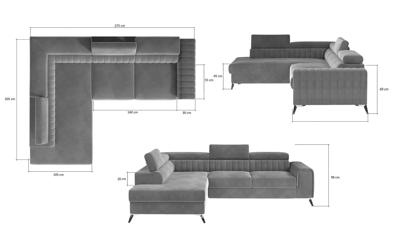 - Pehmeän kulmasohvan ulkomitat: pituus – 275 cm, syvyys – 205 cm, korkeus – 69/98 cm (tyynyn kanssa);