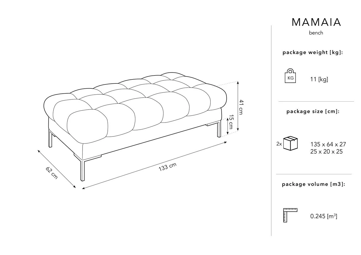 - Istuinosan mitat:pituus – 133 cm, syvyys – 62 cm, korkeus – 40 cm;