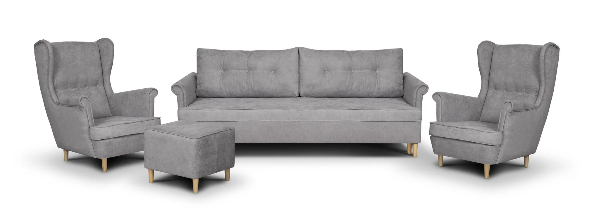 - Setti sisältää: 3-istuttava sohva, 2 nojatuolia ja pinnasänky;