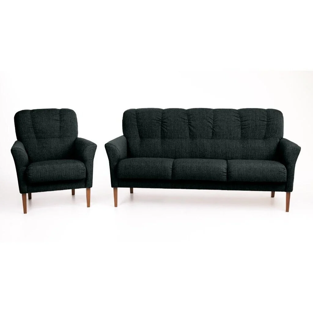 Mitä yksinkertaisempi ja toimivampi huonekalu, sitä paremmin se sopii skandinaaviseen tyyliin. Jos haaveilet puhtaasta, tilavasta ja viihtyisästä ilmapiiristä, Pehmustettu kalustesarja Katri 3+1, , musta Inari 100, jalat – pähkinäpuu on yksi parhaista valinnoista.