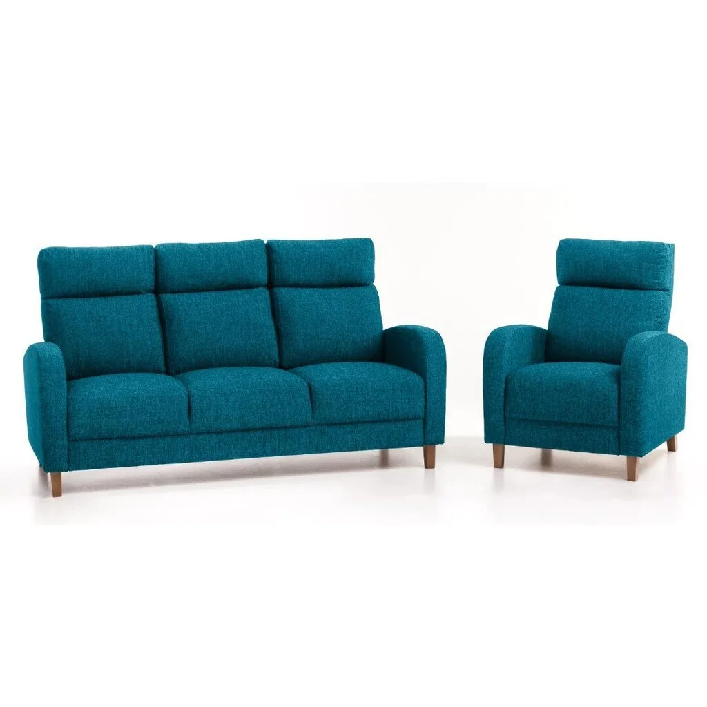 Mitä yksinkertaisempi ja toimivampi huonekalu, sitä paremmin se sopii skandinaaviseen tyyliin. Jos haaveilet puhtaasta, tilavasta ja viihtyisästä ilmapiiristä, Pehmustettu kalustesarja Paris 3+1, , sininen Inari 87, jalat – pähkinäpuu on yksi parhaista valinnoista.