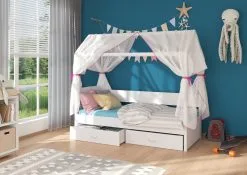 Sänky ADRK Furniture Jonasek Sivuosalla 80x180cm, Valkoinen Sinisellä Katoksella.