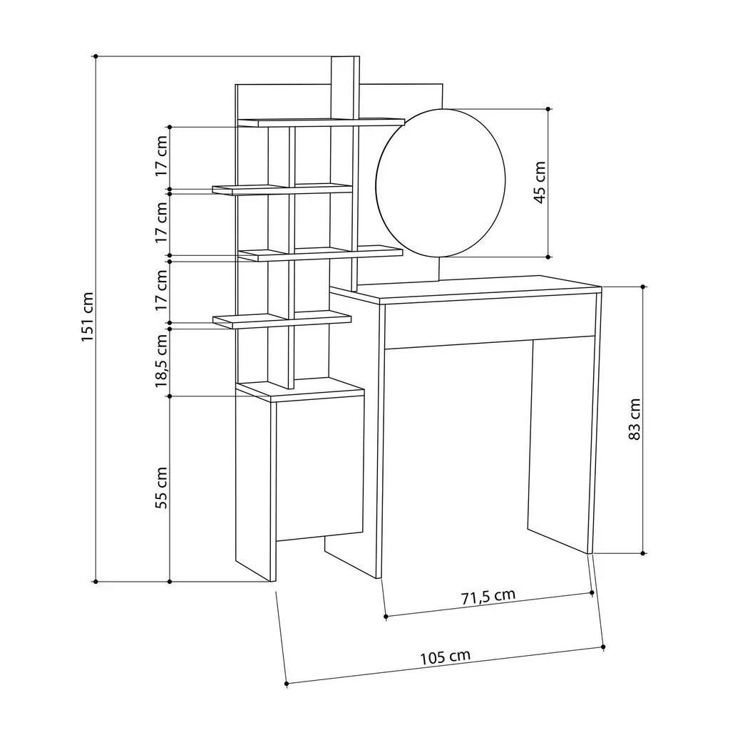 - pöydän mitat: leveys – 105 cm, syvyys – 35 cm, korkeus – 151 cm;