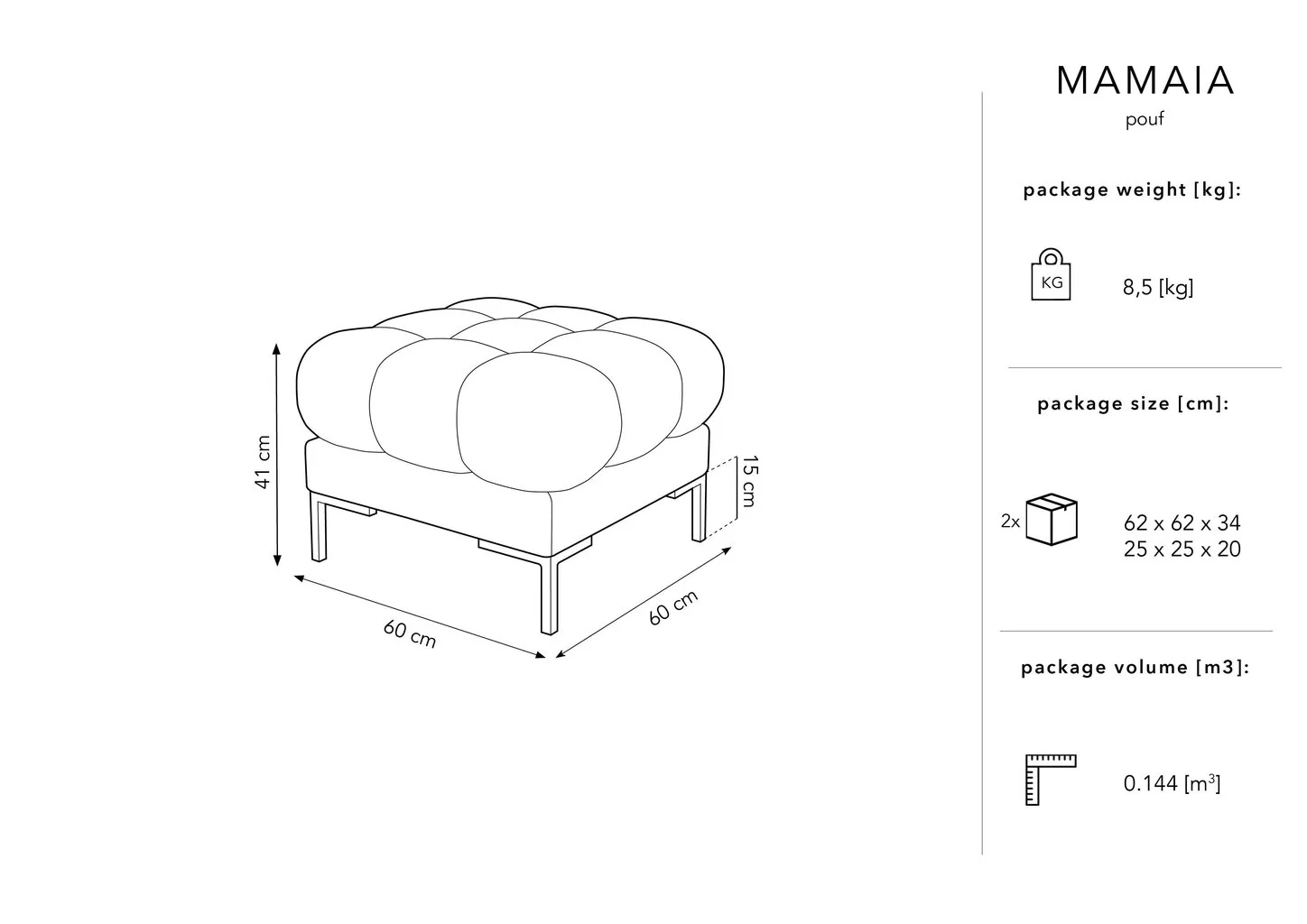 - Rahin mitat: leveys: 60 cm, syvyys: 60 cm, korkeus: 41 cm.