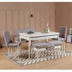 Tyylikäs ja mukava ruokailuhuoneen kalustesarja.. Jokainen perheenjäsen tai vieraasi voi istua mukavasti penkillä ja tuoleilla!. Laajennettavan toiminnon avulla voit pidentää penkkiä ja pöytää, .Jotta mahtuisi enemmän ihmisiä..