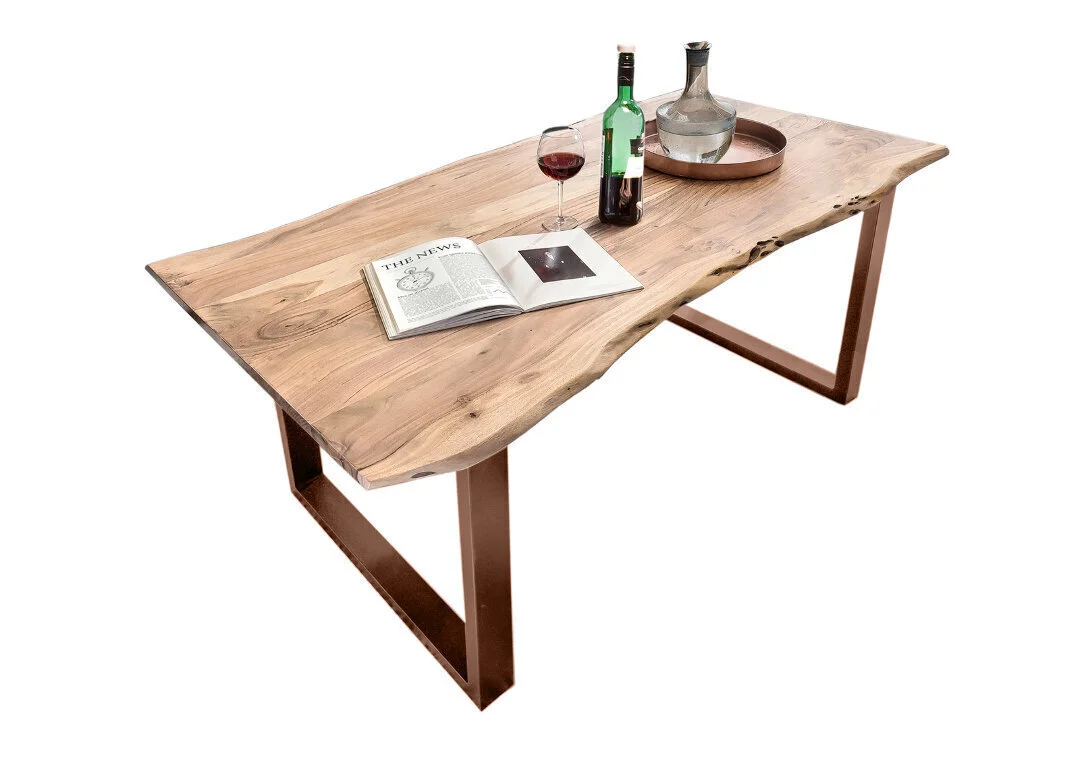 Ruokapöydän kansilevy on valmistettu akaasiapuusta. Viimeistely: luonnonsävy. Jalat ovat antiikinruskeaa metallia. Jokainen tuote on ainutlaatuinen ja voi erota kuvan tuotteesta, koska valmistettu aidosta puusta.
