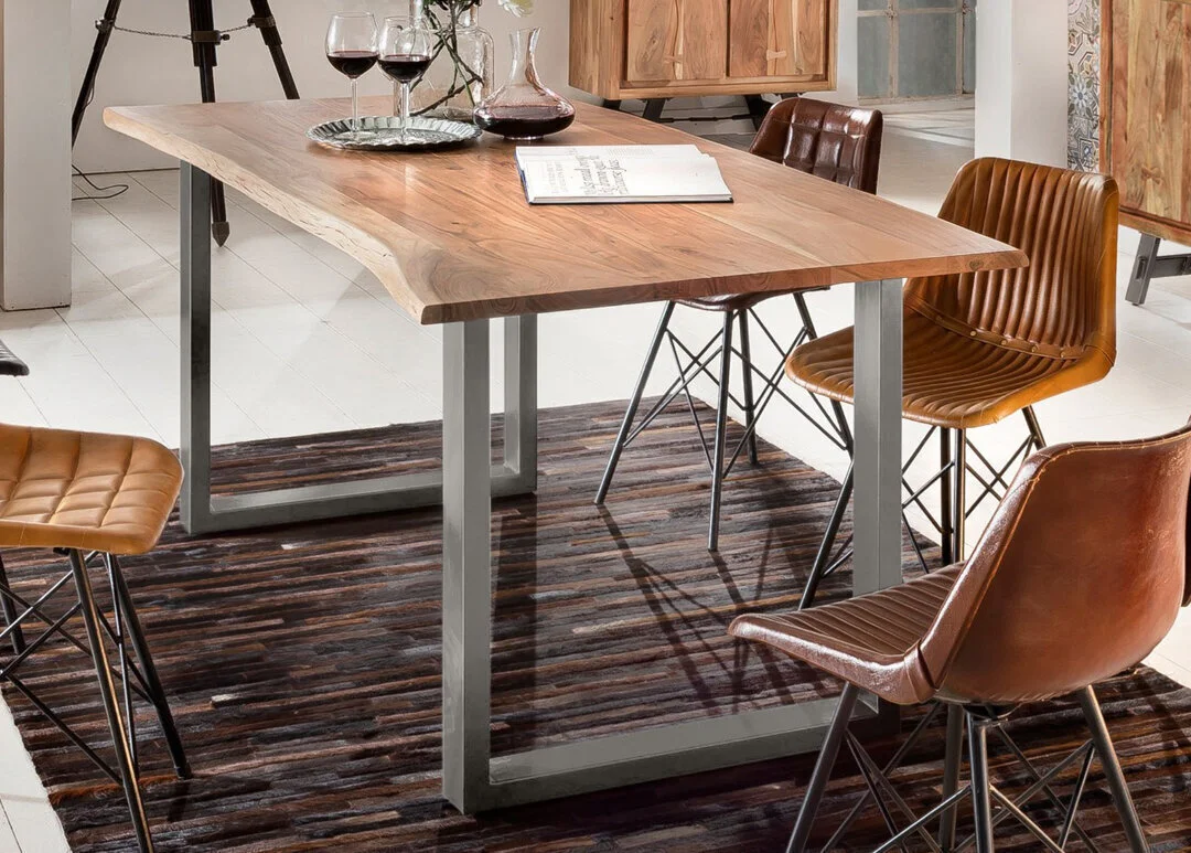 Ruokapöydän kansi on aitoa akaasiapuuta. Kaarevat reunat. Jalat ovat metallia. Jokainen tuote on ainutlaatuinen ja voi erota kuvassa olevasta, koska tuote on valmistettu aidosta puusta.