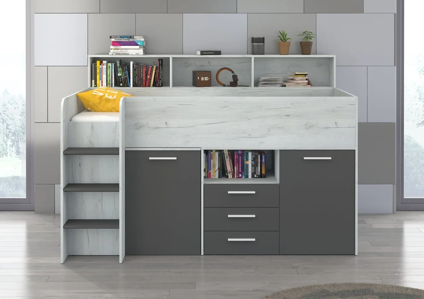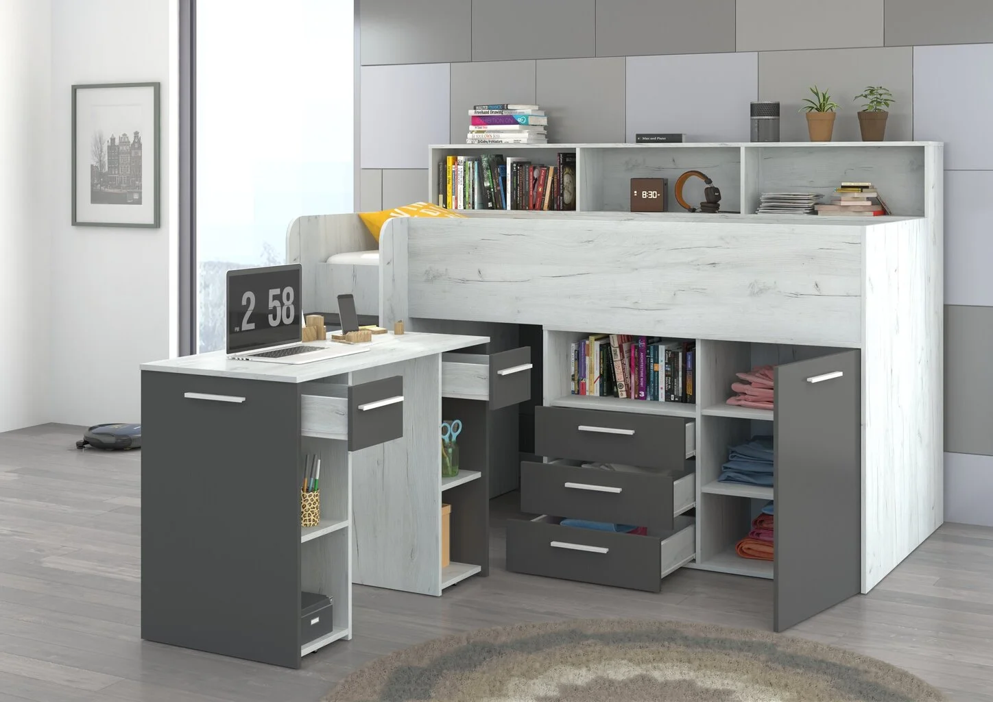 -Tyylikäs lasten sänky kirjoituspöydällä. -Kalusteita täydentävät kaksi ovellista lokeroa, kolme laatikkoa ja neljä avohyllyä, jotta kaikki tarvittavat tavarat löytävät sopivan paikan. -Mukava muotoilu on ihanteellinen niille, jotka säästävät tilaa ja haluavat järjestetyn ja siistin sisustuksen.