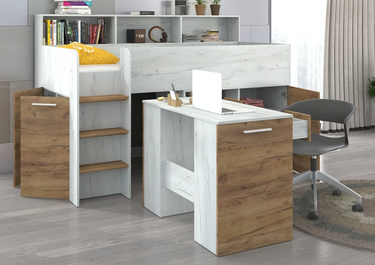 Tyylikäs lasten sänky kirjoituspöydällä. Kalusteita täydentävät kaksi ovellista lokeroa, kolme laatikkoa ja neljä avohyllyä, jotta kaikki tarvittavat tavarat löytävät sopivan paikan. Mukava muotoilu on ihanteellinen niille, jotka säästävät tilaa ja haluavat järjestetyn ja siistin sisustuksen.