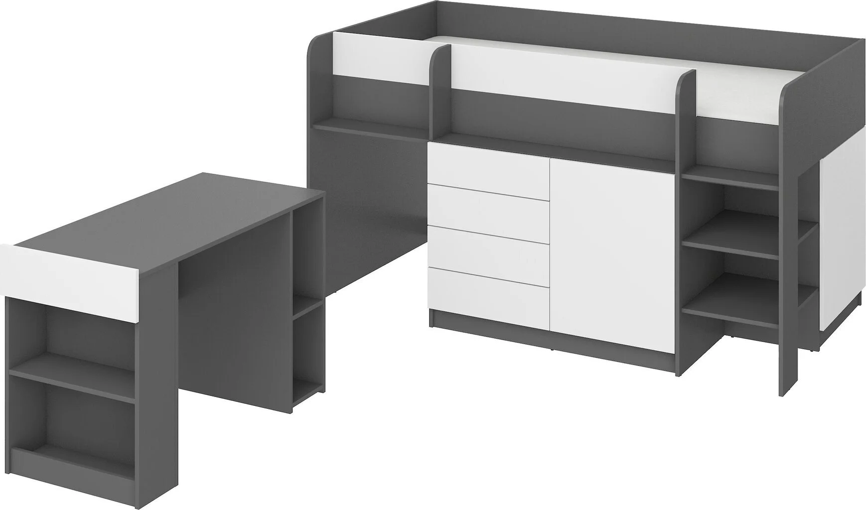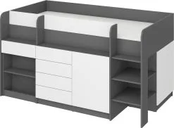 Tyylikäs lasten sänky kirjoituspöydällä. Kalusteita täydentävät kaksi ovellista osiota, neljä laatikkoa ja kaksi avohyllyä, jotta kaikki tarvittavat tavarat löytävät sopivan paikan. Mukava muotoilu on ihanteellinen niille, jotka säästävät tilaa ja haluavat järjestetyn ja siistin sisustuksen.