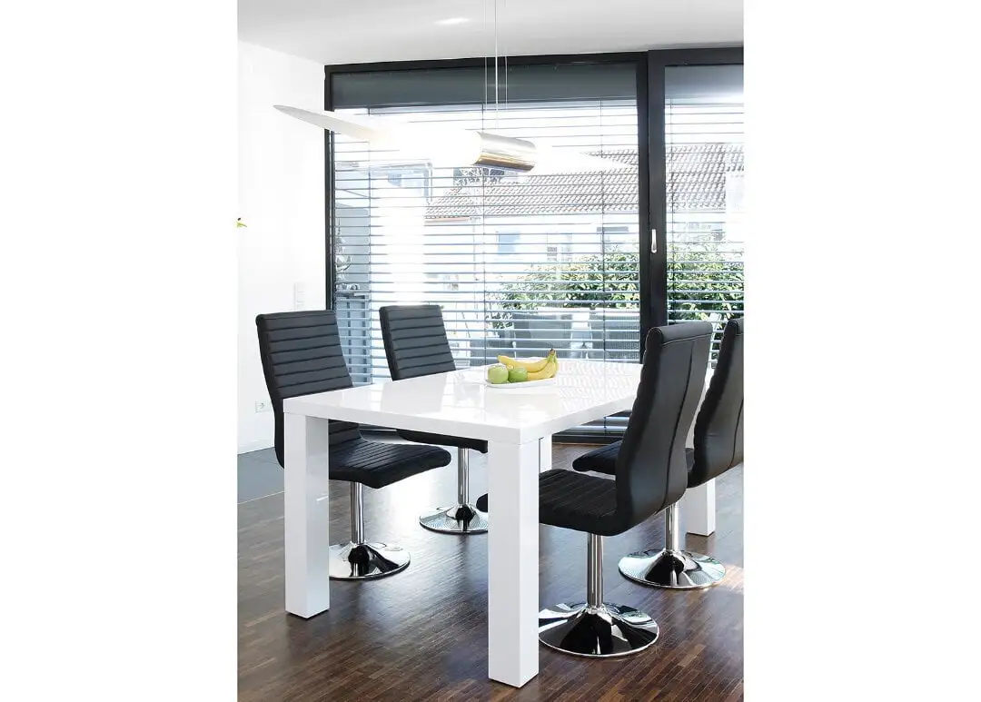 Ruokapöytä on korkeakiiltoista MDF-levyä. Viimeistely: valkoinen korkeakiilto. Pöytälevyn paksuus on 45 mm. Jalat: 10×10 cm.