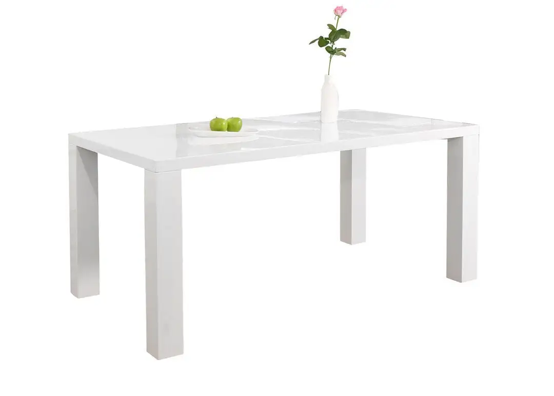 Ruokapöytä on korkeakiiltoista MDF-levyä. Viimeistely: valkoinen korkeakiilto. Pöytälevyn paksuus on 45 mm. Jalat: 10×10 cm.