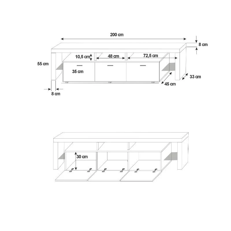 Mitat: korkeus – 55 cm, leveys – 200 cm, syvyys – 45 cm.