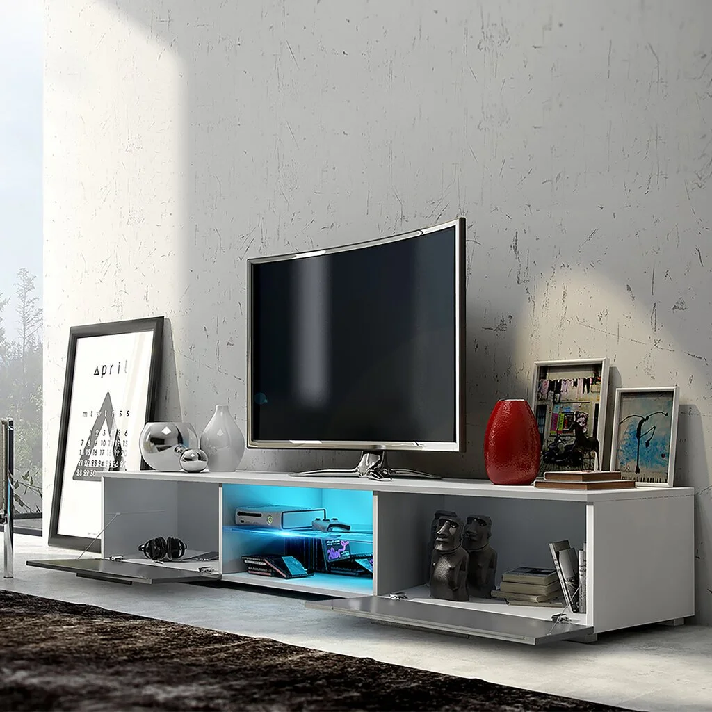 TV-taso, jossa on 2 ovea ja sisäpuoli on jaettu 1 osaan. Keskellä on 1 lasihylly, jossa on LED-valaistus.
