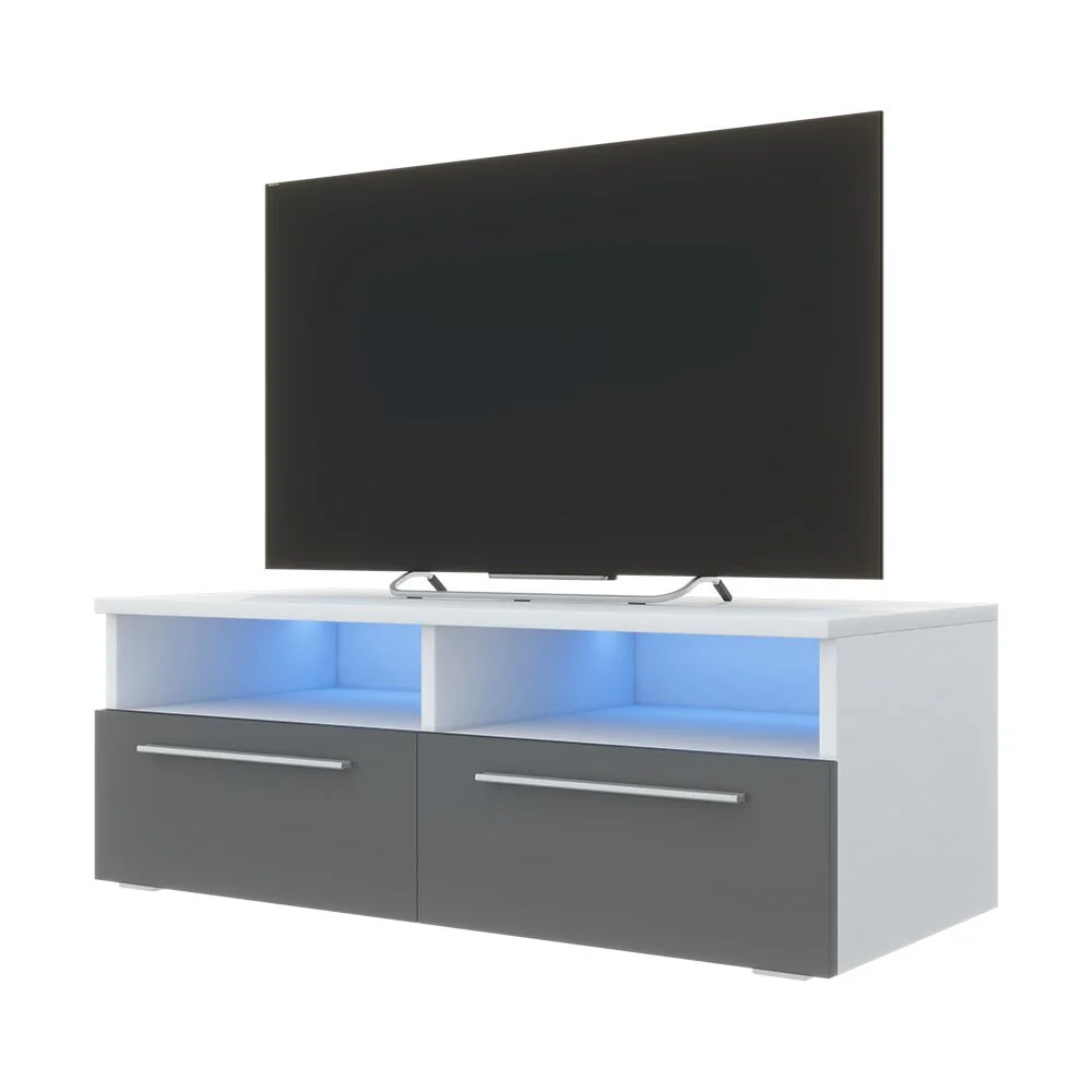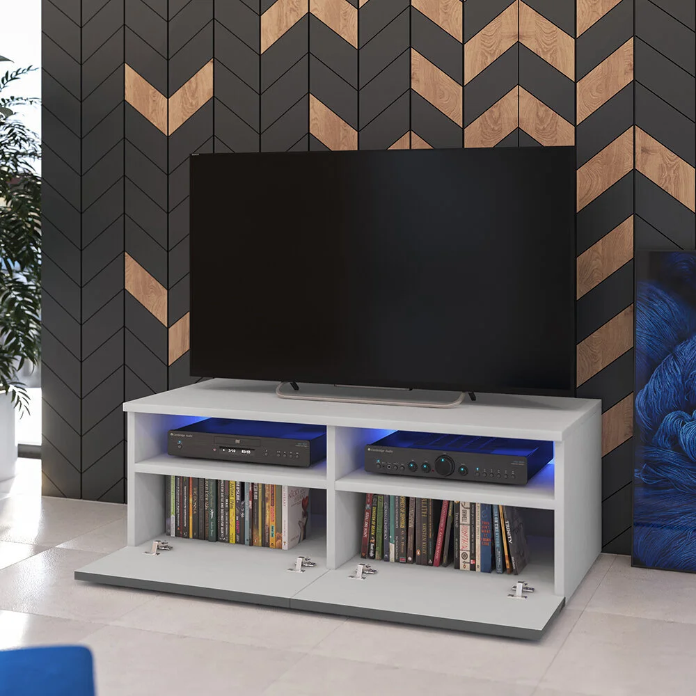 TV-taso, jossa on kaksi ovea ja lasihylly LED-valaistuksella.