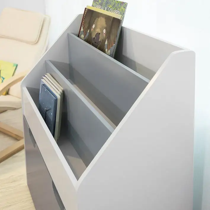 Vapaasti seisovan kirjahyllyn moderni muotoilu sopii erinomaisesti lapsille.