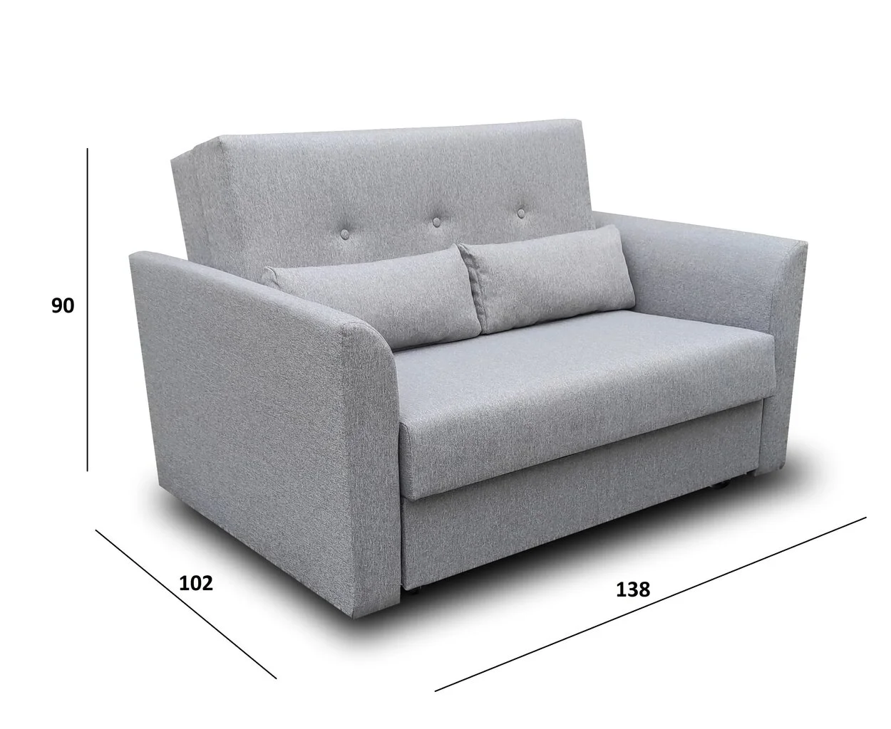 - Mitat: pituus 138 cm, syvyys 102 cm, korkeus 90 cm;