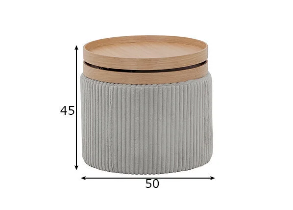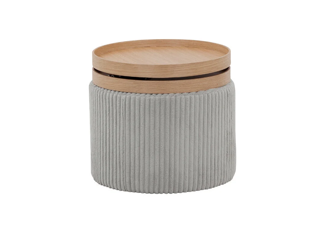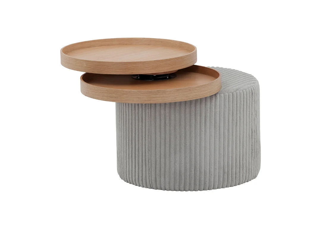 Sohvapöytä on kankaalla verhoiltua MDF-kalustelevyä, ylempi osa on viimeistelty tammiviilulla. Kaksi päällimmäistä osaa ovat säädettävissä.