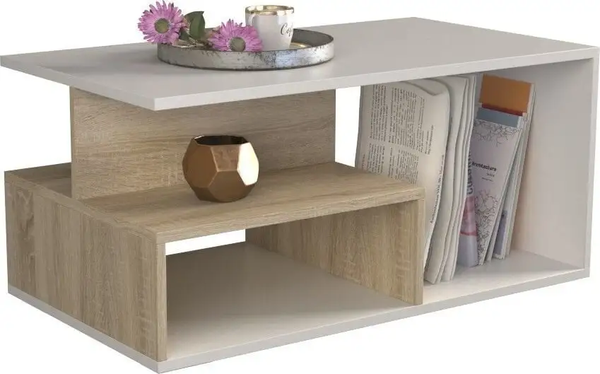 Levyn yläkerros peitetään usein erityisellä kalvolla, joka varmistaa huonekalun lujuuden. Viimeisimpien tuotantoteknologioiden avulla nämä laatat voivat olla kosteudenkestäviä, minkä vuoksi nämä materiaalit eroavat monipuolisuudestaan ja sopivat mihin tahansa huoneeseen. Sohvapöytä Prima, valkoinen/tummanruskea löytää varmasti paikan kodistasi!