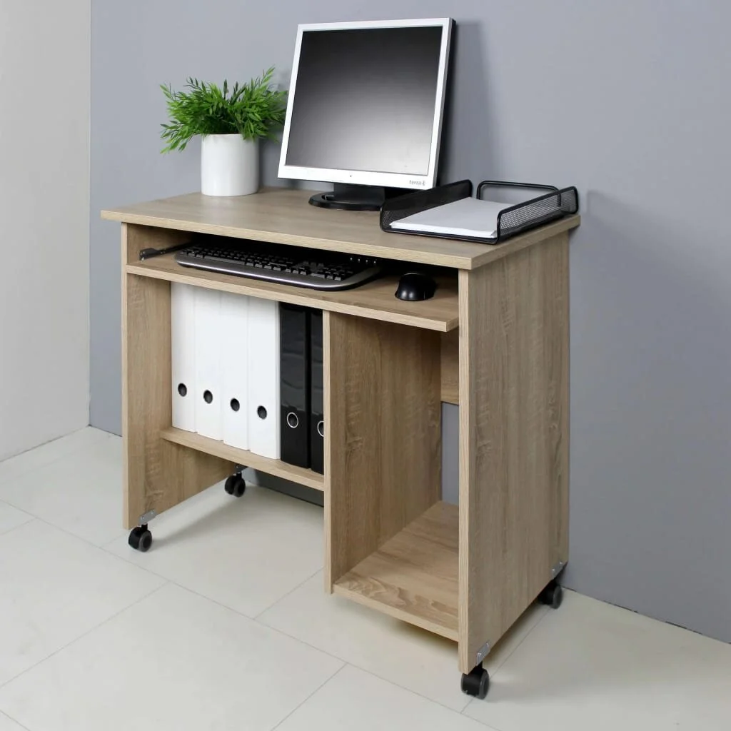 Germania-tietokonepöytä on käytännöllinen toimistopöytä, jossa on runsaasti tilaa tietokoneen keskusyksikölle ja näppäimistölle. Pöytä on valmistettu kauniista Sonoma-tammesta laminoidusta lastulevystä. Kompaktin kokonsa ansiosta tämä malli soveltuu erityisesti kotiin ja pieniin toimistoihin. Työtasossa on kaksi avointa hyllyä, ja kumpikin niistä kestää jopa 10 kg:n painon. Oikealla puolella oleva avoin hylly tarjoaa runsaasti tilaa tietokonelaatikolle. Lisäksi helppokäyttöisen näppäimistölaatikon alla on runsaasti tilaa useille kansioille (mahtuu jopa 7 kg). Itse pöytä kestää jopa 30 kg:n painon, joten se on kestävä ja luotettava. Työpöydän älykkään rakenteen ansiosta voit pitää kaikki työmateriaalit näkyvillä ja ulottuvillasi myös pienemmissä toimistoissa. Lisäksi käytännölliset pyörät ovat toinen hyödyllinen yksityiskohta, joka mahdollistaa pöydän joustavan käytön.