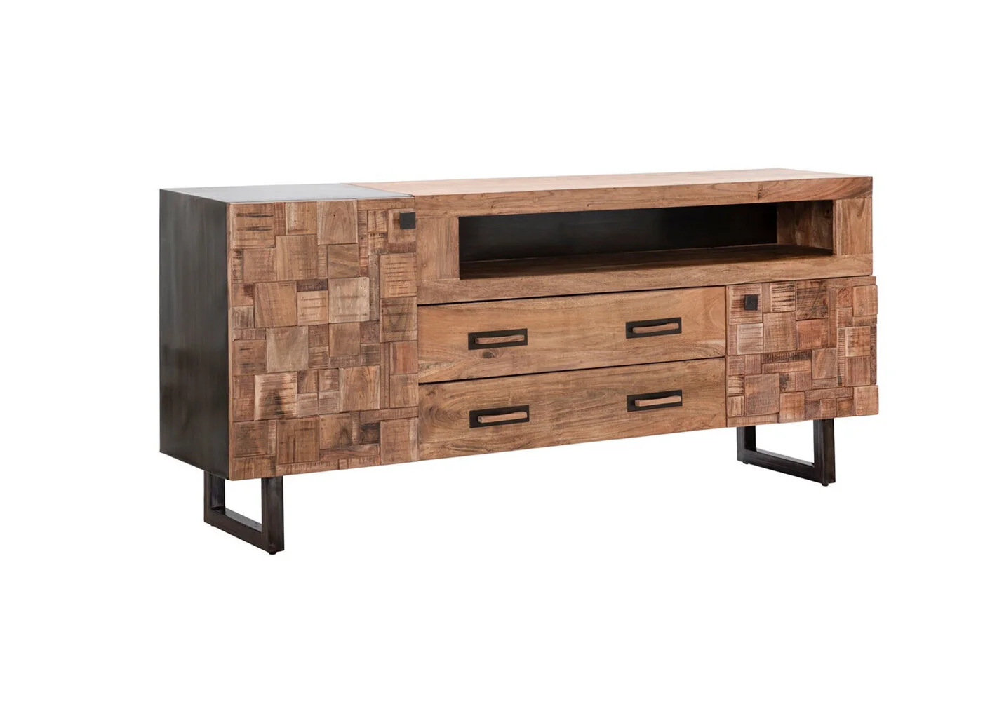 Teollisuustyylinen akaasiapuinen TV-pöytä Metalliset vetimet ja mustat jalat Kaksi ovea ja kaksi laatikkoa Suuren oven takana on yksi hylly. Laatikko liikkuu ilman kiskoja.
