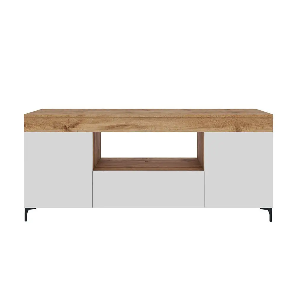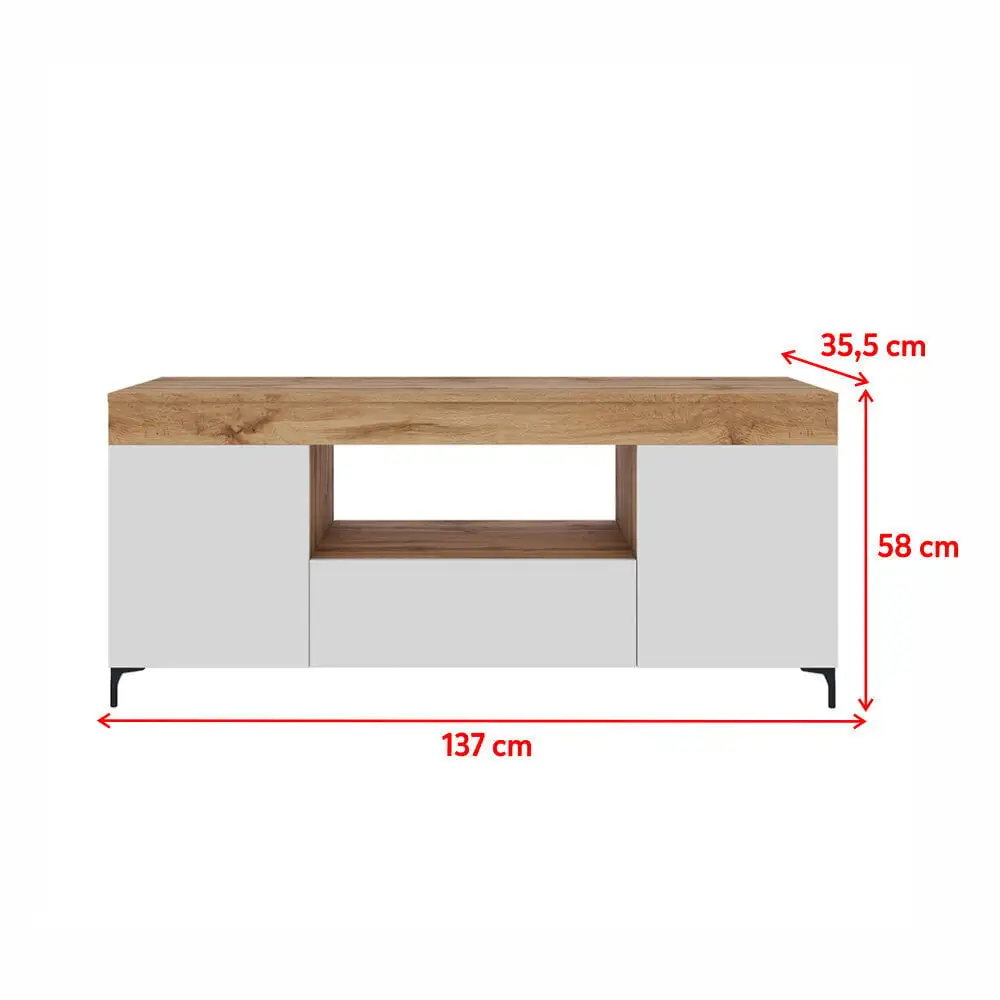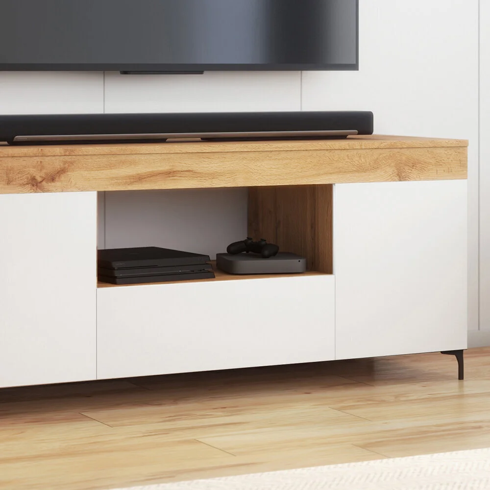 Tyylikäs Gusto TV-taso auttaa muuttamaan olohuoneesi tilaksi, joka ilahduttaa kauneudellaan ja korrektilla ulkonäöllään. Taso, jossa on kolme lukittavaa lokeroa ja kolme avointa hyllyä, joihin voit piilottaa elektroniikkalaitteet, tarvikkeet ja muut pienet esineet. Yleisesti käytetyt laitteet (esim. lisävarusteet tai pelikonsoli) voidaan sijoittaa leveälle pöytätasolle, mikä paitsi helpottaa niiden käyttöä, myös varmistaa jatkuvan ilmankierron, jotta laitteet eivät ylikuumene. Mielenkiintoisen muotoilun ja värien yhdistelmän ansiosta Gusto-pöytä monipuolistaa tehokkaasti kaikki olohuoneen tyylit.
