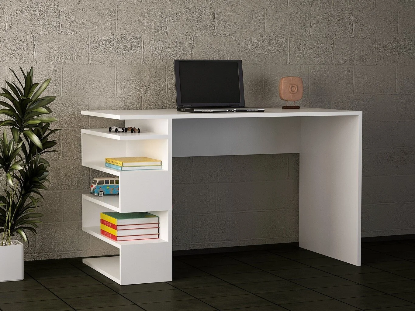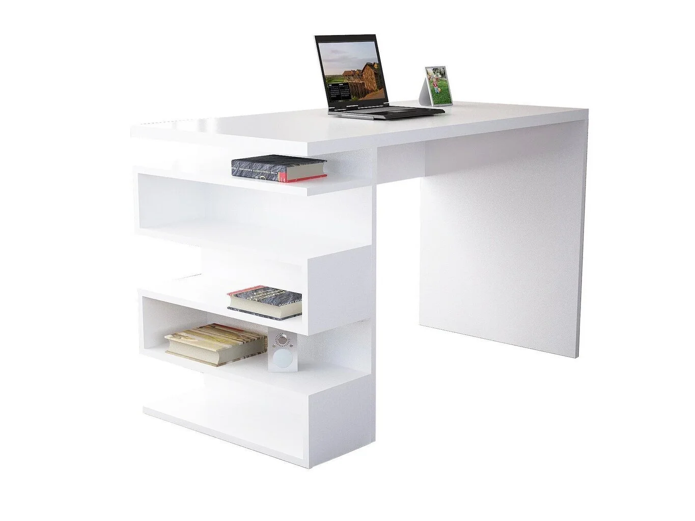 Mukava ja käytännöllinen työpöytä hyllyllä, johon mahtuu leluja ja muita tavaroita kirjojen ja paperitavaroiden lisäksi.. Modernisti muotoiltu pöytä sopii niin työ- ja lastenhuoneeseen kuin toimistoonkin..