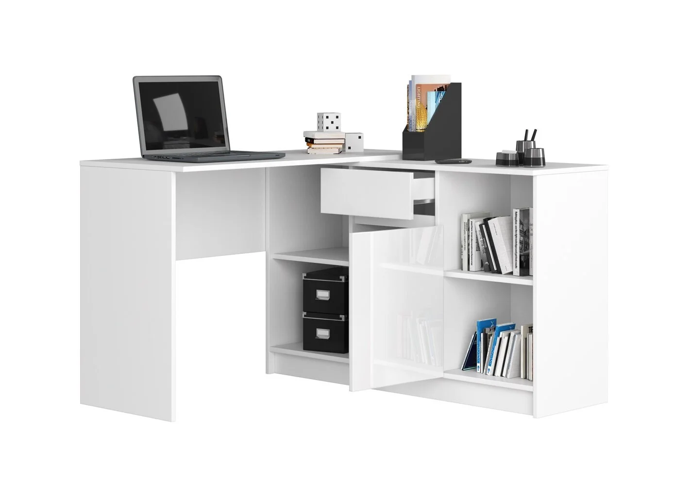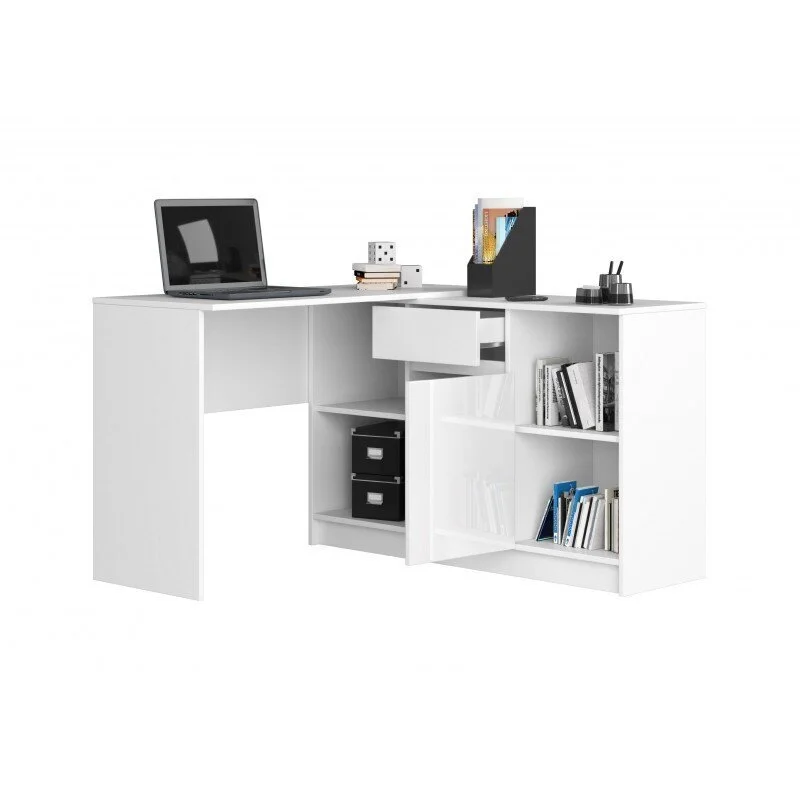 - Työpöydän kulmassa on kaksi avointa lokeroa, joissa on hyllyt, jotka sopivat täydellisesti kansioihin,