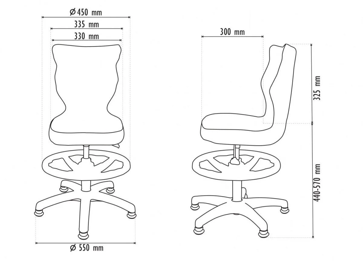 - Tuolin istuimen korkeus (lattia): koholla – 44 cm, madallettu – 57 cm, leveys – 33,5 cm; syvyys – 30. cm;