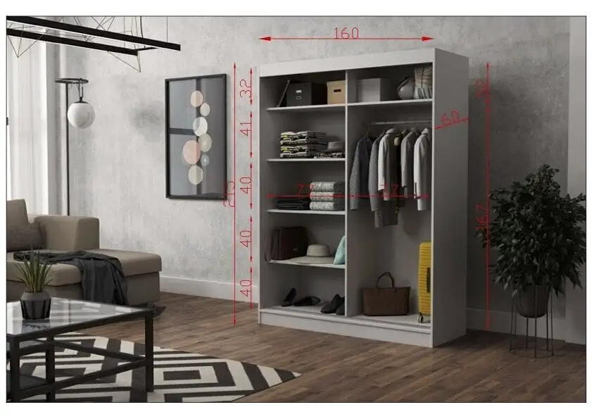 • Kaapin mitat leveys 160 cm, syvyys 60 cm, korkeus 215 cm;