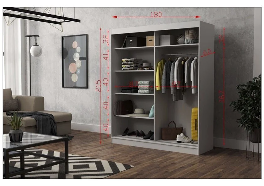 - -Kaapin mitat leveys 180 cm, syvyys 60 cm, korkeus 215 cm;