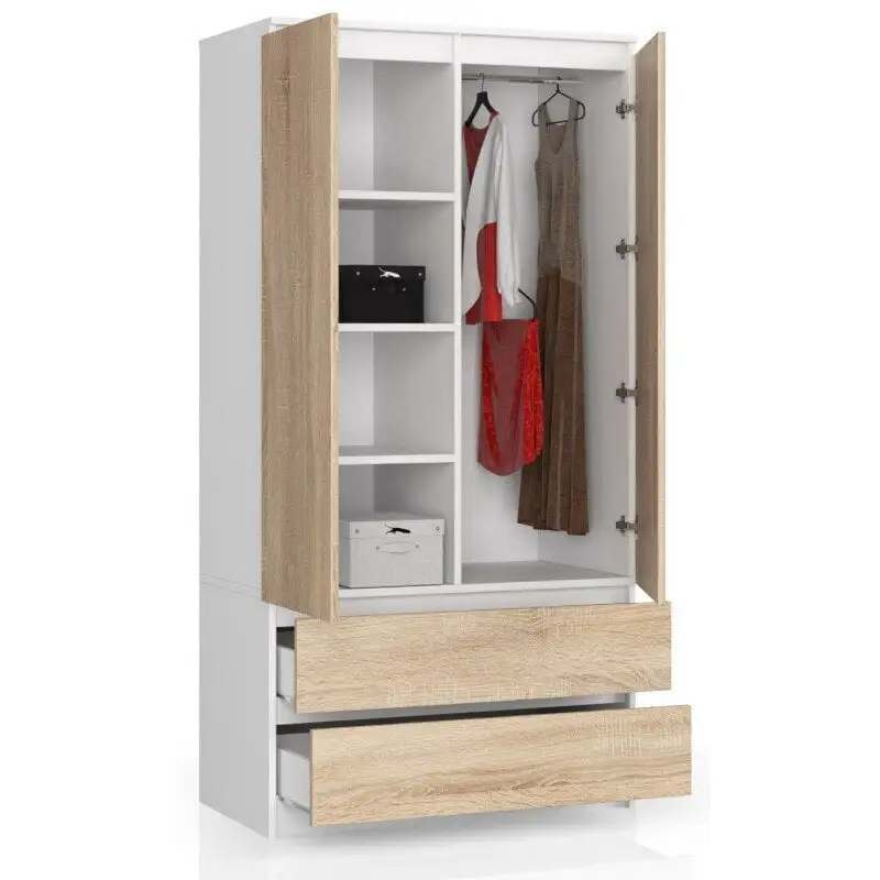 Levyn yläkerros peitetään usein erityisellä kalvolla, joka varmistaa huonekalun lujuuden. Viimeisimpien tuotantoteknologioiden avulla nämä laatat voivat olla kosteudenkestäviä, minkä vuoksi nämä materiaalit eroavat monipuolisuudestaan ja sopivat mihin tahansa huoneeseen. Vaatekaappi NORE S90, valkoinen / tammi. löytää varmasti paikan kodistasi!