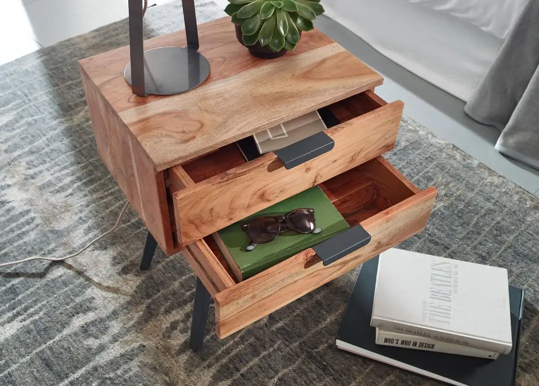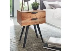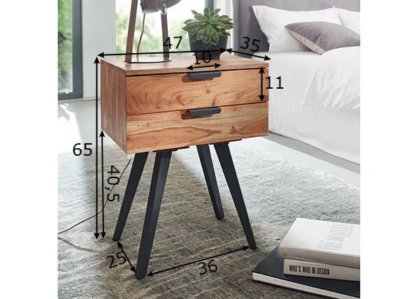 design Lovely bedside table in a trendy industrial style Equipped with two spacious drawers Night console with a mix of wood and metal Dimensions Width: 47 cm Height: 65 cm Depth: 35 cm Inner dimensions per drawer (WxHxD): 38.5 x 7 x 26.5 cm Body height: 24.5 cm Ground clearance: 40.5 cm Maximum load capacity: 20 kg colour Body: brown Legs and handles: gray particularities Each bedside cabinet has been lovingly handcrafted and is therefore absolutely unique The drawers can be removed using rotatable wooden stoppers The surfaces of the night console are covered with a protective clear lacquer Due to its size, the bedside table is ideal for box spring beds material Body: solid acacia wood, coated with clear lacquer Legs and handles: lacquered iron scope of delivery A night console without decoration Assembly instructions and material are included in the delivery Assembly Delivery condition: partially assembled, only the legs have to be attached Care instructions Clean the surface with a lukewarm cotton cloth. Do not use abrasives, strong cleaning agents or dripping wet cloths.