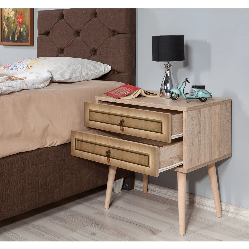 Levyn yläkerros peitetään usein erityisellä kalvolla, joka varmistaa huonekalun lujuuden. Viimeisimpien tuotantoteknologioiden avulla nämä laatat voivat olla kosteudenkestäviä, minkä vuoksi nämä materiaalit eroavat monipuolisuudestaan ja sopivat mihin tahansa huoneeseen. Yöpöytä Kalune Design 869, 61 cm, tammi/keltainen väri. löytää varmasti paikan kodistasi!