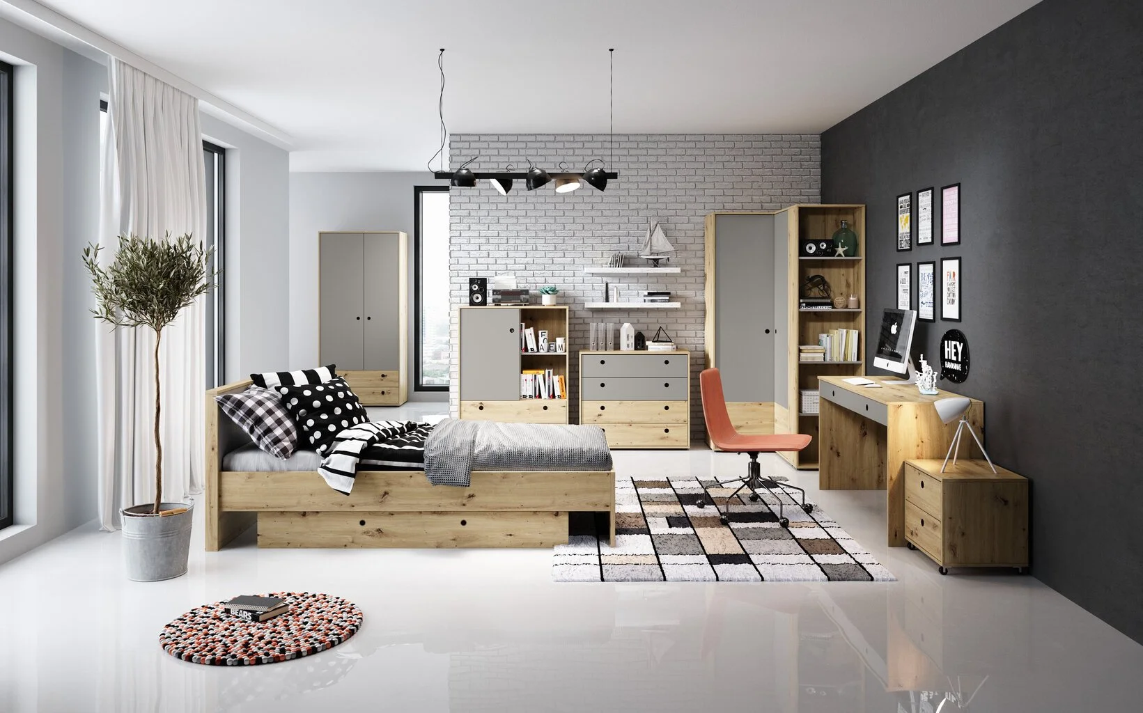 –Kuki huonekalumallisto yhdistää leikkisästi harmaata ja lämpimiä, luonnollisia, ruskean sävyjä. -Tämä on loistava valinta asuintilan luomiseen nuorelle.