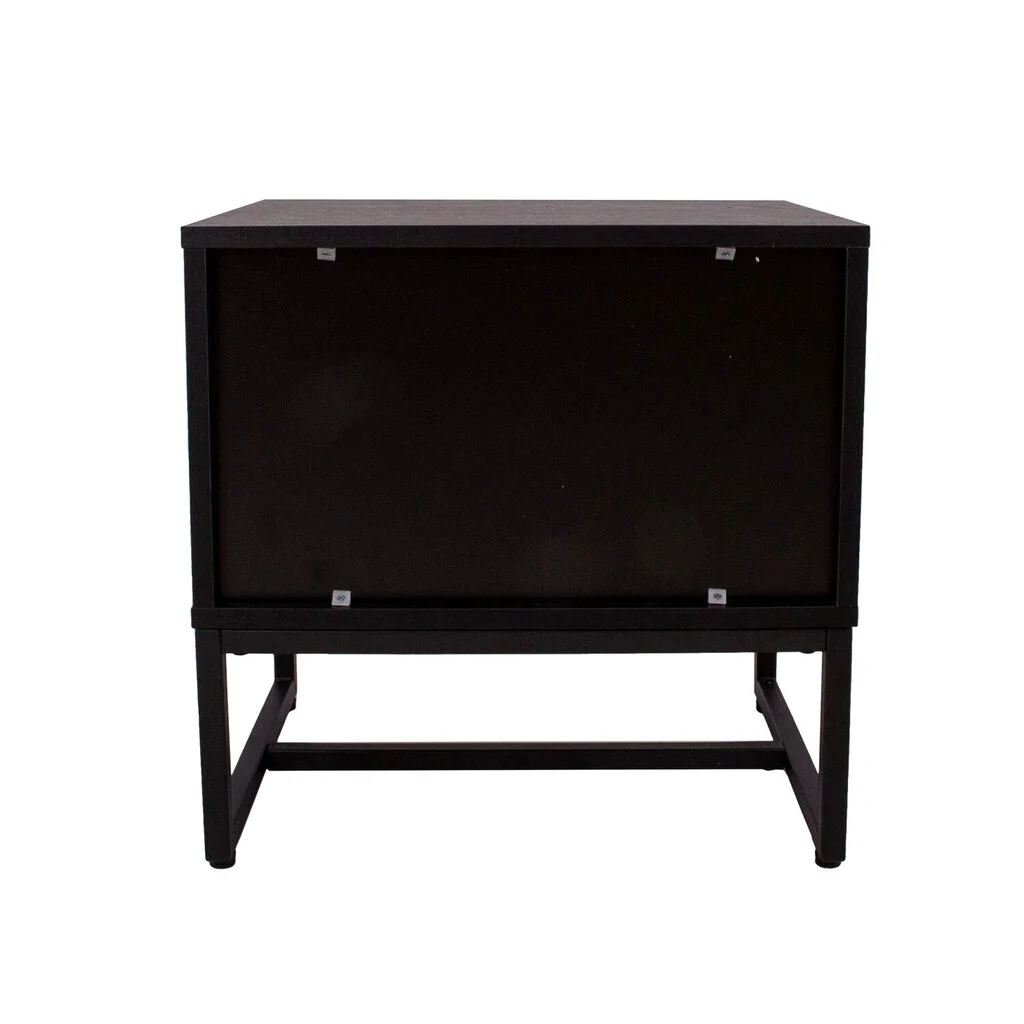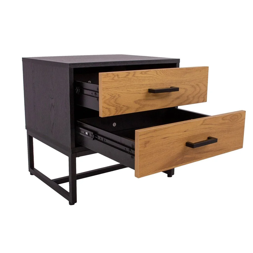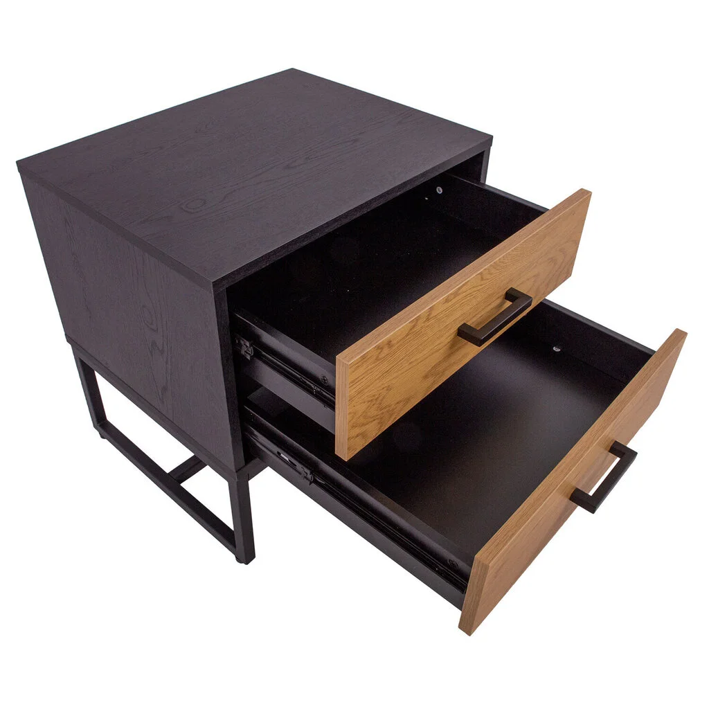 Yöpöytä AMSTERDAM 50x40xH50cm. Materiaali: melamiinilevy, väri: tammi/musta. Musta metallirunko. Pehmeästi sulkeutuvat laatikoiden liukukiskot. alumiiniset kahvat